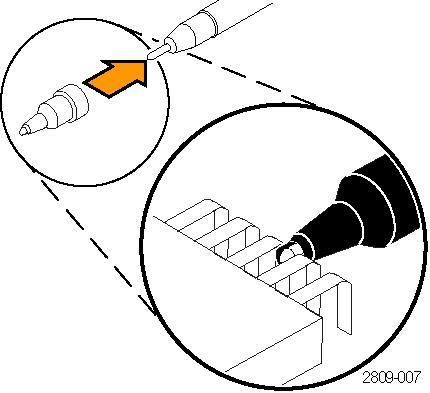 ![]() | Universal IC cap: Use this cap to prevent shorting the probe tip between IC pins. Snap the cap onto the probe tip, and then spin the cap to expose the probe tip toward the IC lead. |
