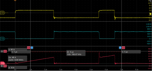 在实际测试结果中,器件的开启延迟Tdon为15.06ns,上升时间Tr为11.1ns,关断延迟为13.02ns,下降时间Tf为13ns。在高压大电流的硬开关条件下实现了极高的开关速度。