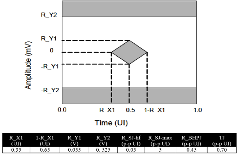 LVDS和JESD204B规范里就有抖动和眼图模板测试。翻开JESD Spec,会发现它清晰地定义了近端和源端的眼图模板。眼图不得碰到三块模板(灰色区域)里的任何一块,否则测量项就是Fail的。