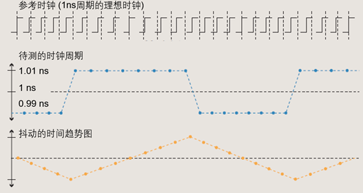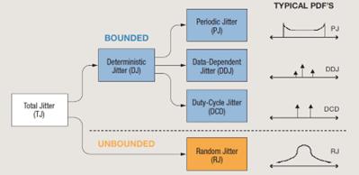 与随机抖动对应的,是确定性抖动(Dj, Deterministic Jitter),它是有界的。在有限的样本数之内,Dj的峰峰值会很快趋于稳定,并维持不变。Dj的测量结果常常用峰峰值来表示。Dj最重要的两个成分是周期性抖动(PJ, Periodic Jitter )和数据相关性抖动(DDJ, Data-Dependent Jitter)。
