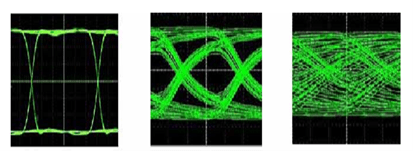 ISI不仅会影响到抖动,也会让眼图恶化。下图是一个高速信号,从发送端,到传输路径中间的测试点,再到接收端的眼图变化。我们看到,随着传输线距离的增加,ISI抖动愈发严重,眼图的眼宽和眼高都明显收窄,甚至到最后眼图完全闭合了。