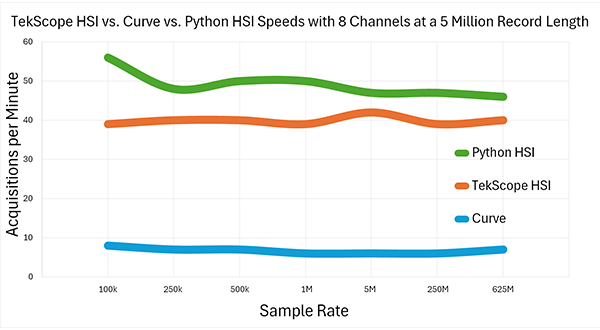 HSI drastically improves your test and measurement data transfer experience. At 1M sample rate, compared to CURVE acquisitions per minute is four times faster with TekScope PC and five times faster with TekHSI Python drivers. The GUI-based remote analysis tool TekScope PC favors higher cpu core and thread counts for performance.