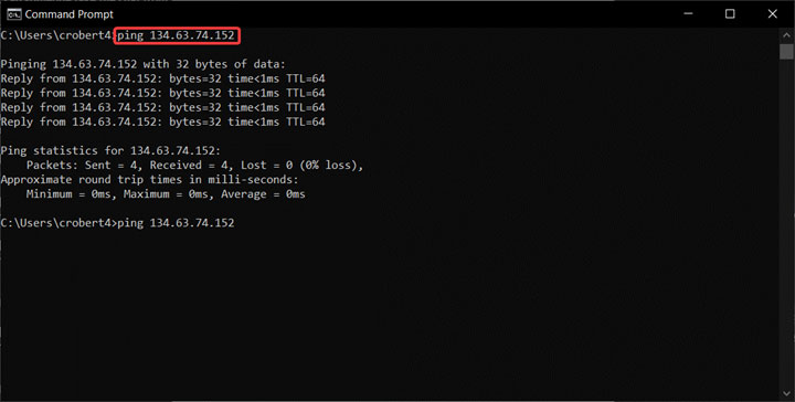 8. Using the Command Prompt, ping the instrument IP address by typing “ping XXX.XXX.XXX.XXX” and verify that the instrument responds (The X’s represent your instruments IP address)
