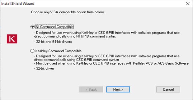 c. When using the ki-488.exe installer to apply the latest driver, make sure to select “NI command compatible.” Do not select “Keithley command compatible”